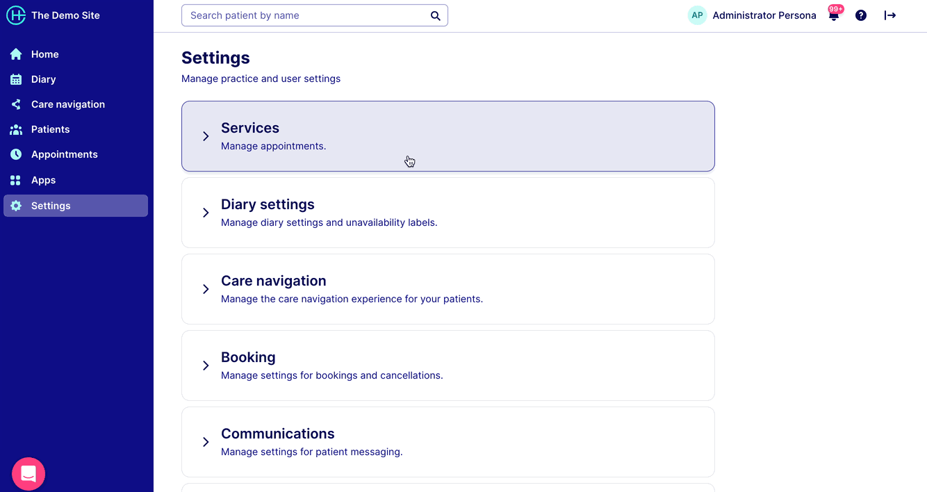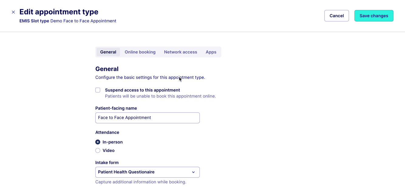 You will need to go to the appointments page in the Services settings. Once you have found the appointment you would like to make available for cross-organisational booking you should click Options and then Edit. Now click the Network access tab and change the checkbox button to My practice and my networks.