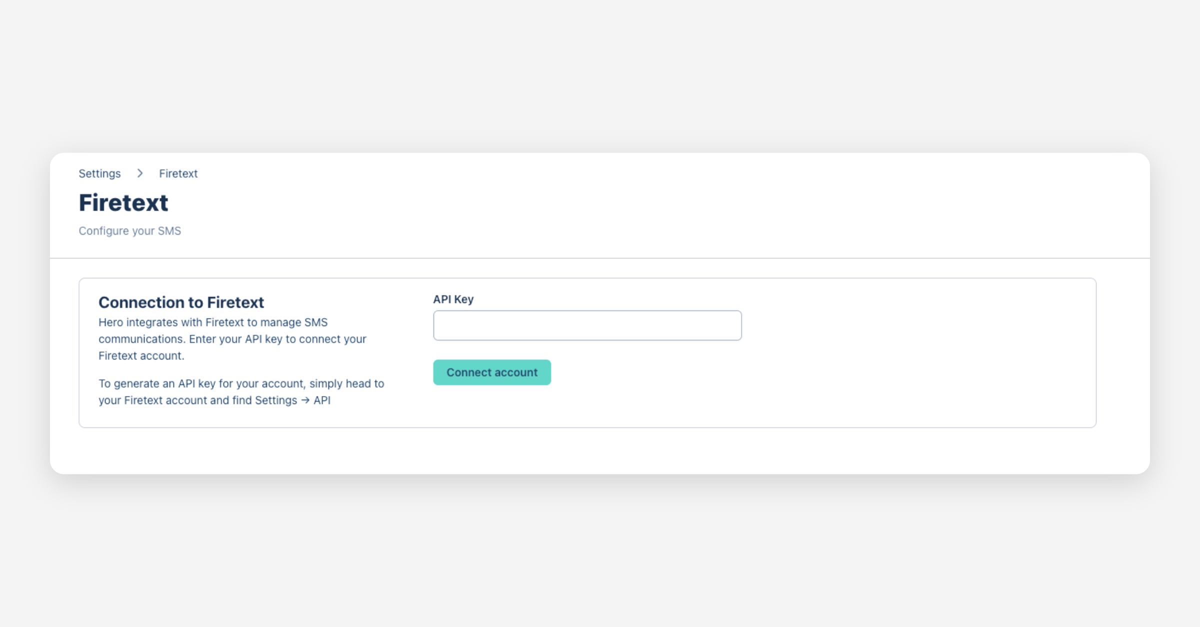 In Hero, navigate to Settings > Integrations > Firetext. Paste the copied API key into the designated field and select "Connect your account". This action links your Hero account with Firetext, enabling SMS functionality