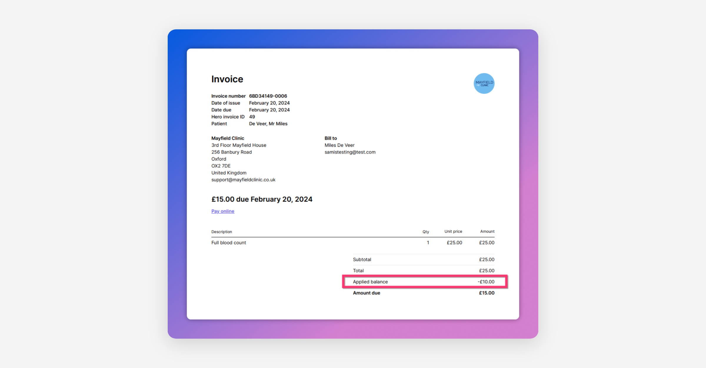 For example, Mr John Deer is unable to attend his pre-paid appointment late notice. Rather than refunding him (and risk being out of pocket), the practice chooses to store the pre-payment as an invoice credit. This invoice credit will then be deducted from Mr Deer's next invoice.