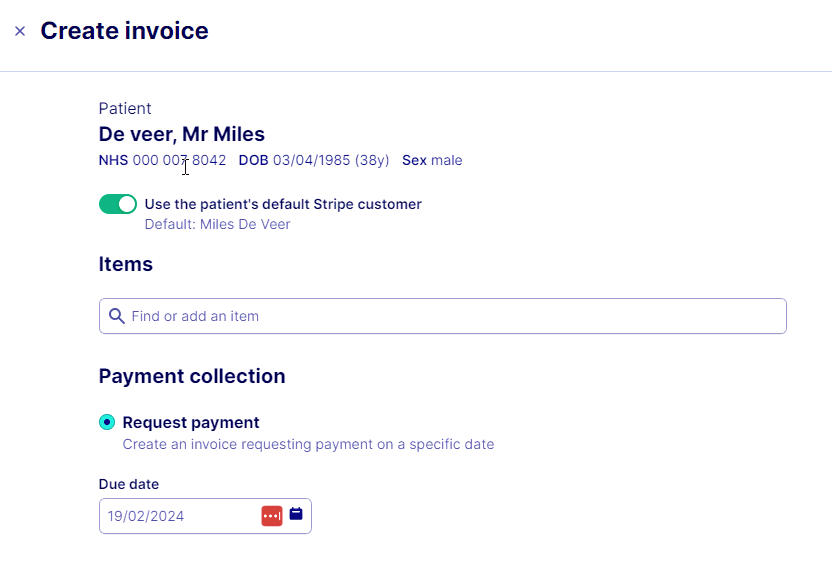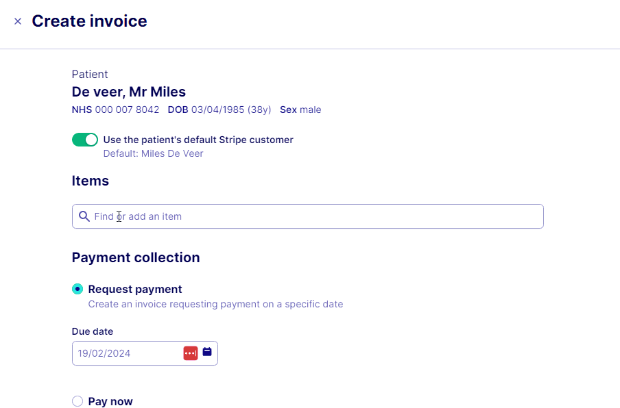 Review, and if necessary change the Stripe customer (the individual or entity responsible for paying the invoice) - by default, the Stripe customer will be the same as the patient, but you can set a different default Stripe customer for each patient (see this article)