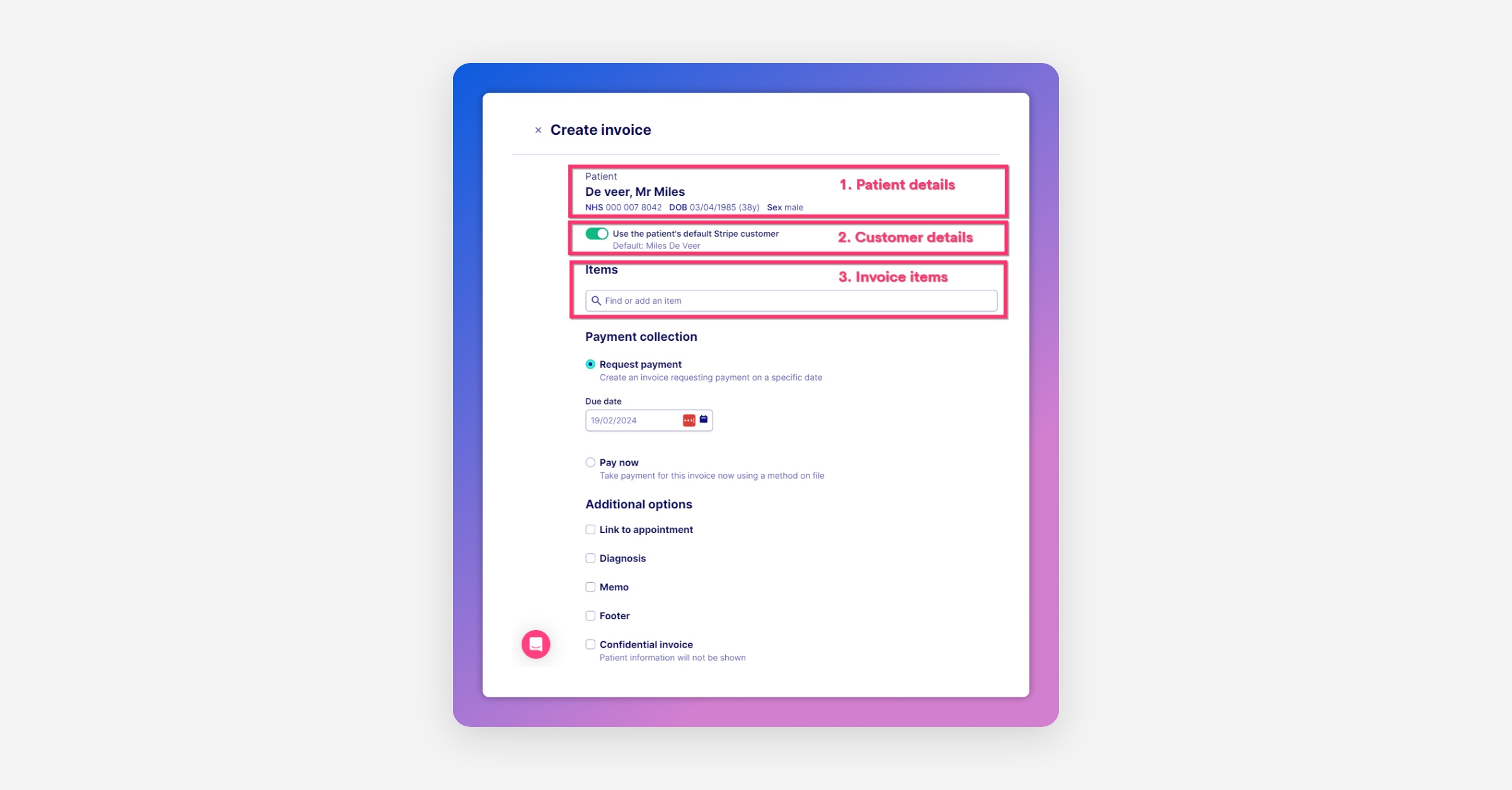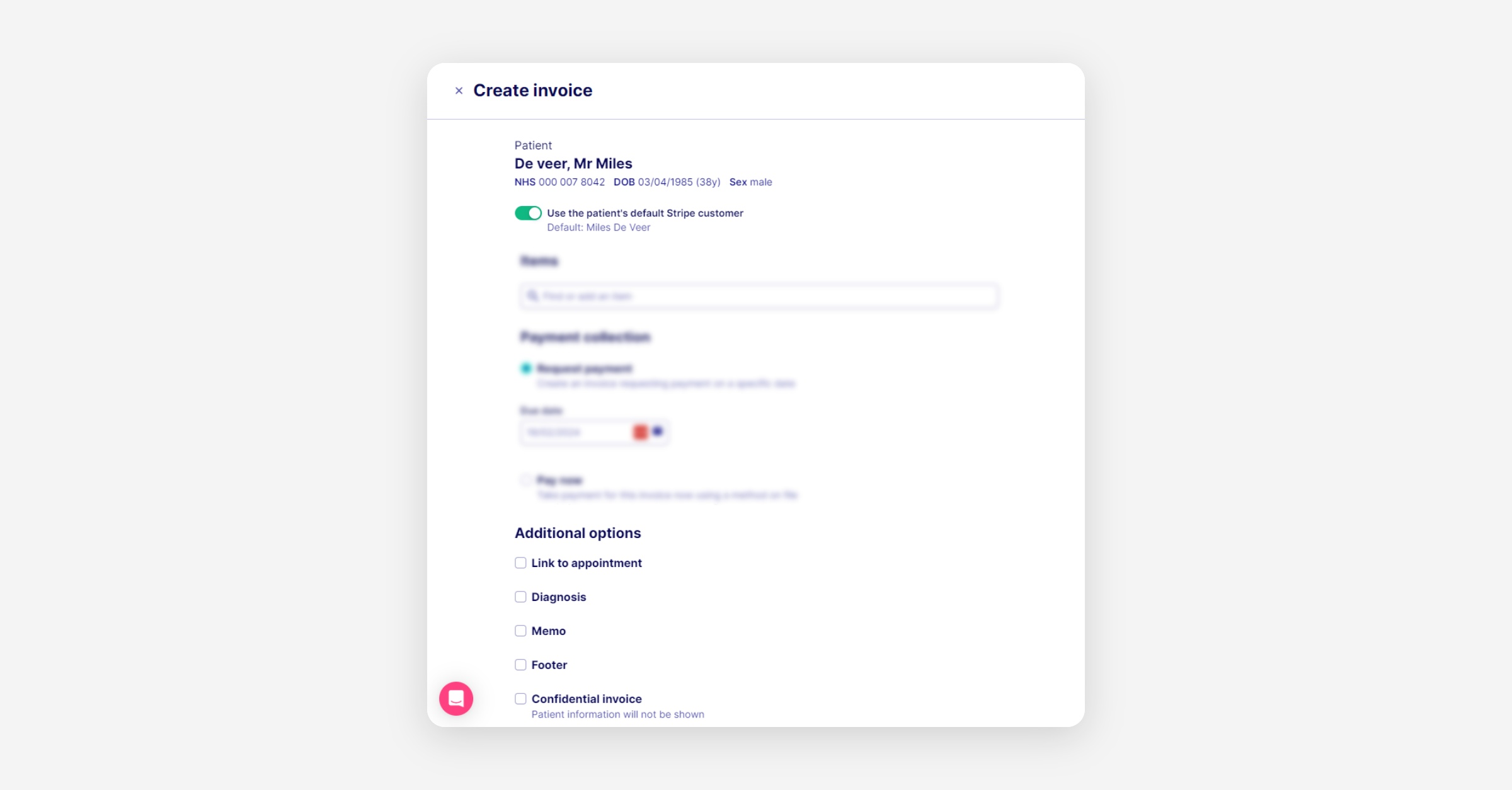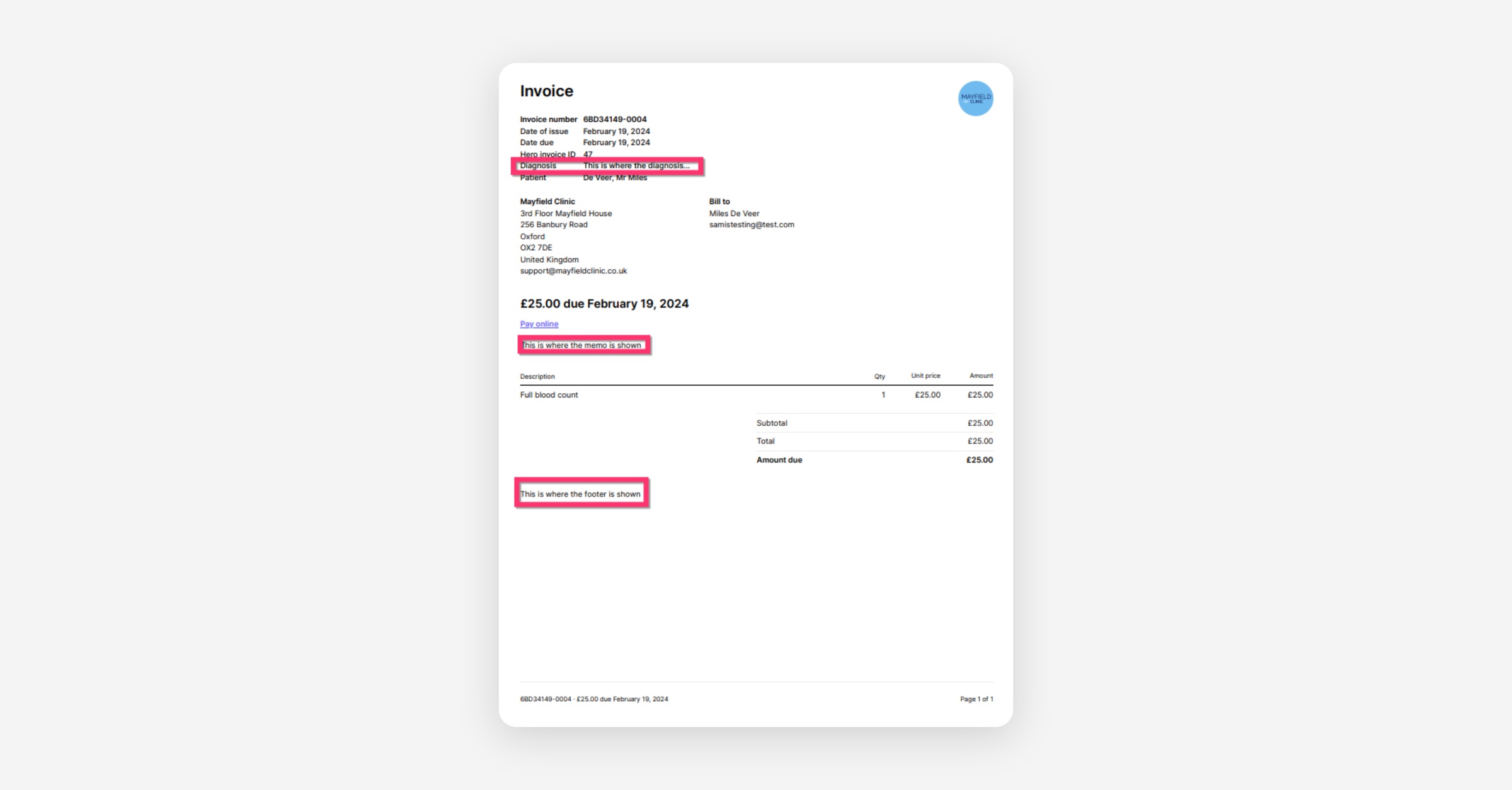 The Invoice PDF contains details of the patient (unless marked as confidential), Stripe customer and (where included) the Diagnosis, Memo and/or Footer.