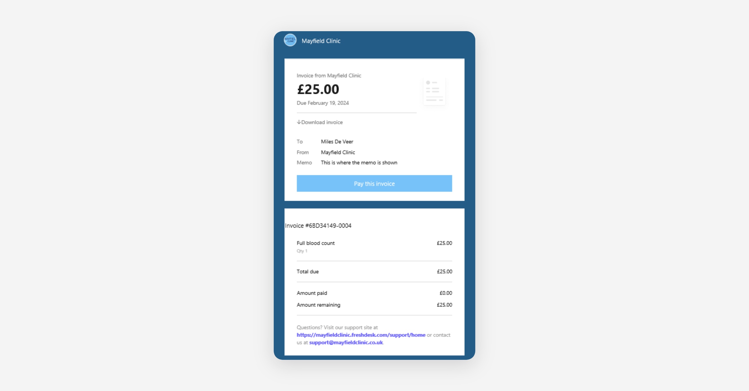 Once you've created the invoice, the selected Stripe customer will be sent an email confirming the invoice and including a link to make a payment. The styling of this email (example shown below) can be updated within the Stripe brand settings.