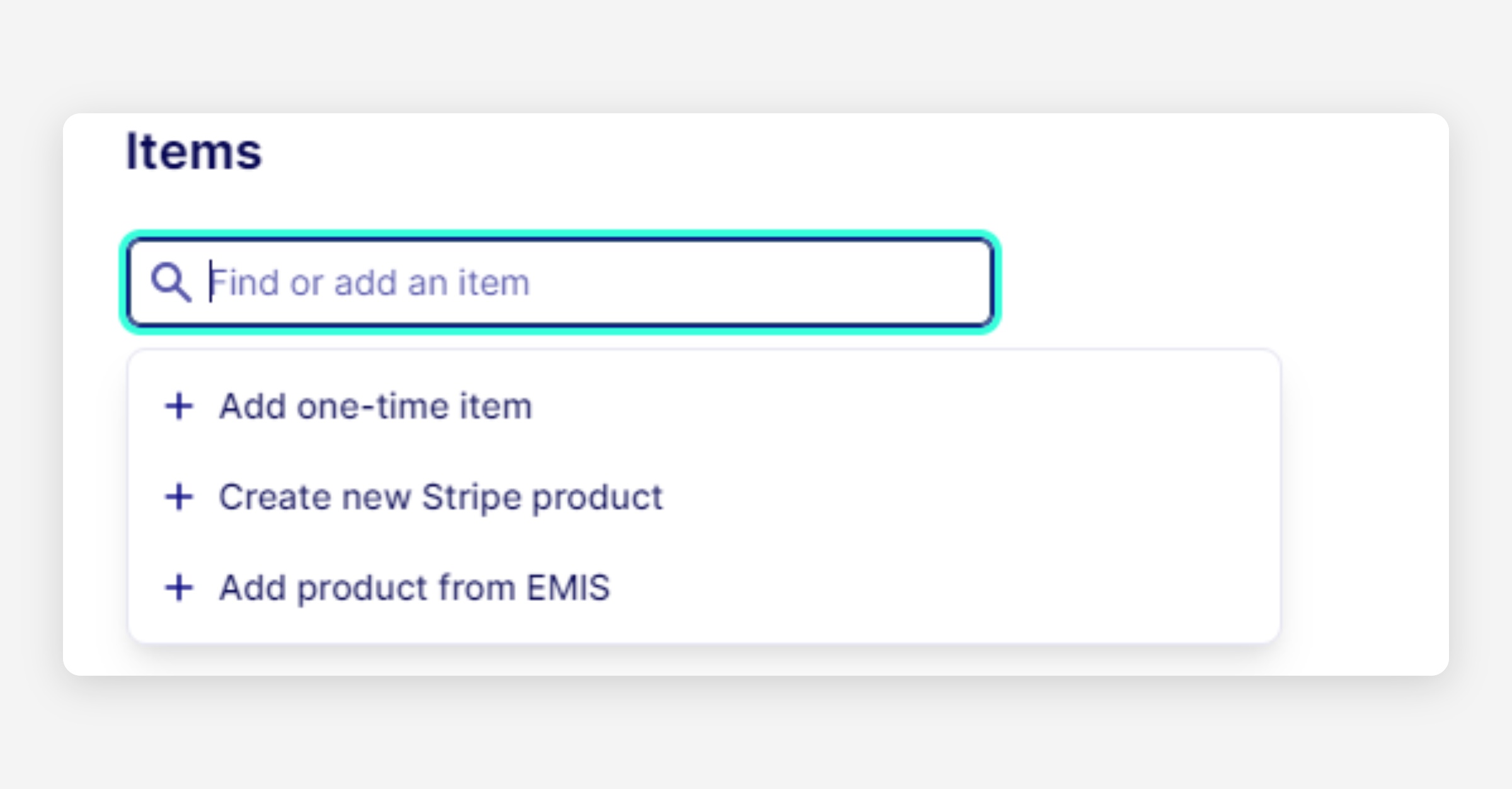 When you click into the Items search, you can start searching your Stripe product catalogue (see this article for how to add items to your Stripe catalogue). For example, this GIF shows what you would see if you searched in our Demo Practice for a "Full blood count".