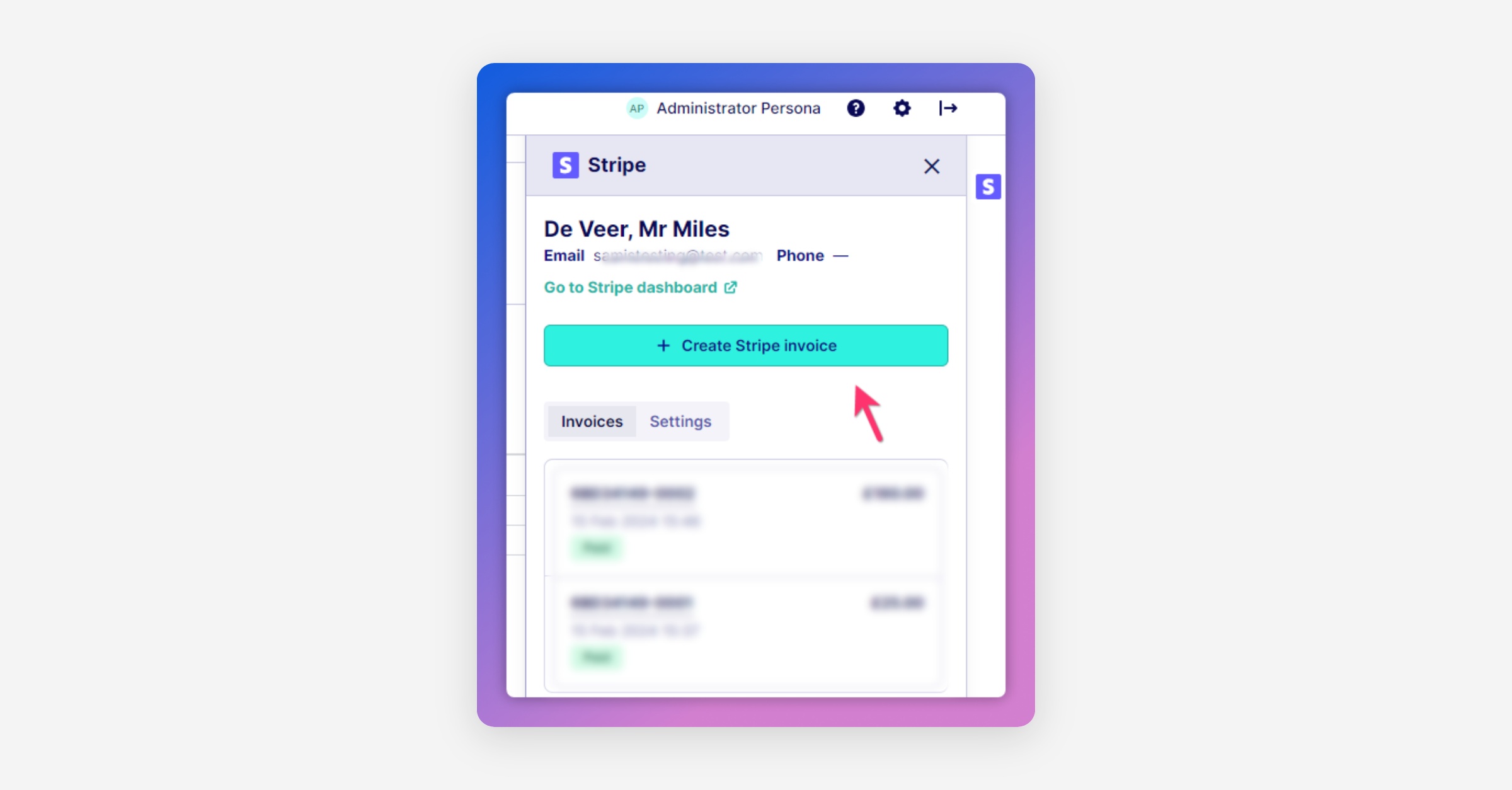 Once the Stripe App is opened you'll see past invoices and the Stripe settings for the selected patient (if you're viewing the Stripe App on an appointment, you'll also see a tab for invoices associated with the selected appointment).