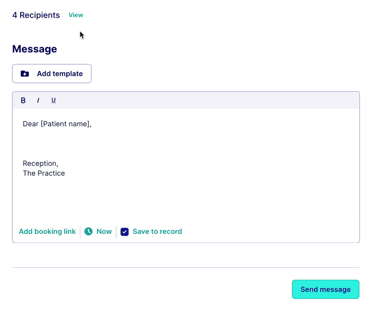We recommend scheduling the message to be sent either at lunch time (12:00 - 13:00) or at the end of the day (17:00 - 19:00). This is when patient are most likely to see and respond to your message.💡