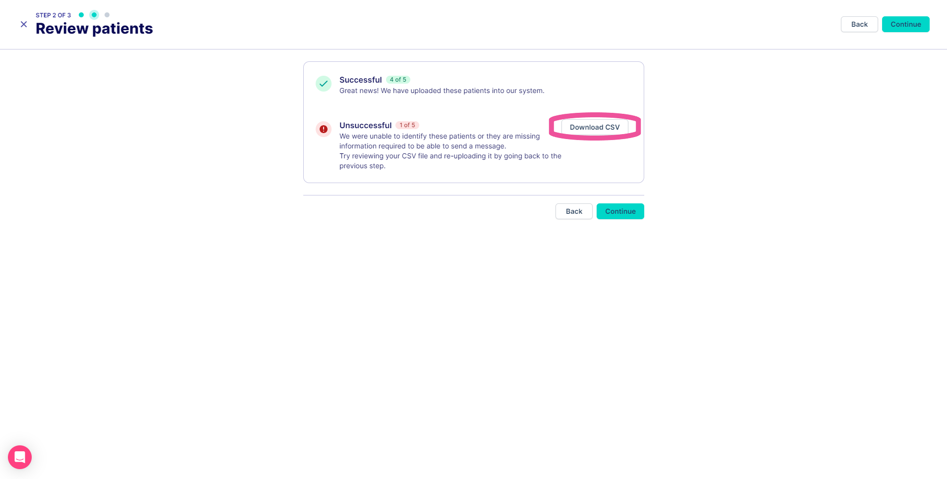 A successful upload means that Hero Health successfully retrieved the contact details from the PDS. Unsuccessful uploads refer to patients whose information we were unable to retrieve. You can download a CSV file for unsuccessful uploads. The CSV file will provide reasons for each patient's upload failure.