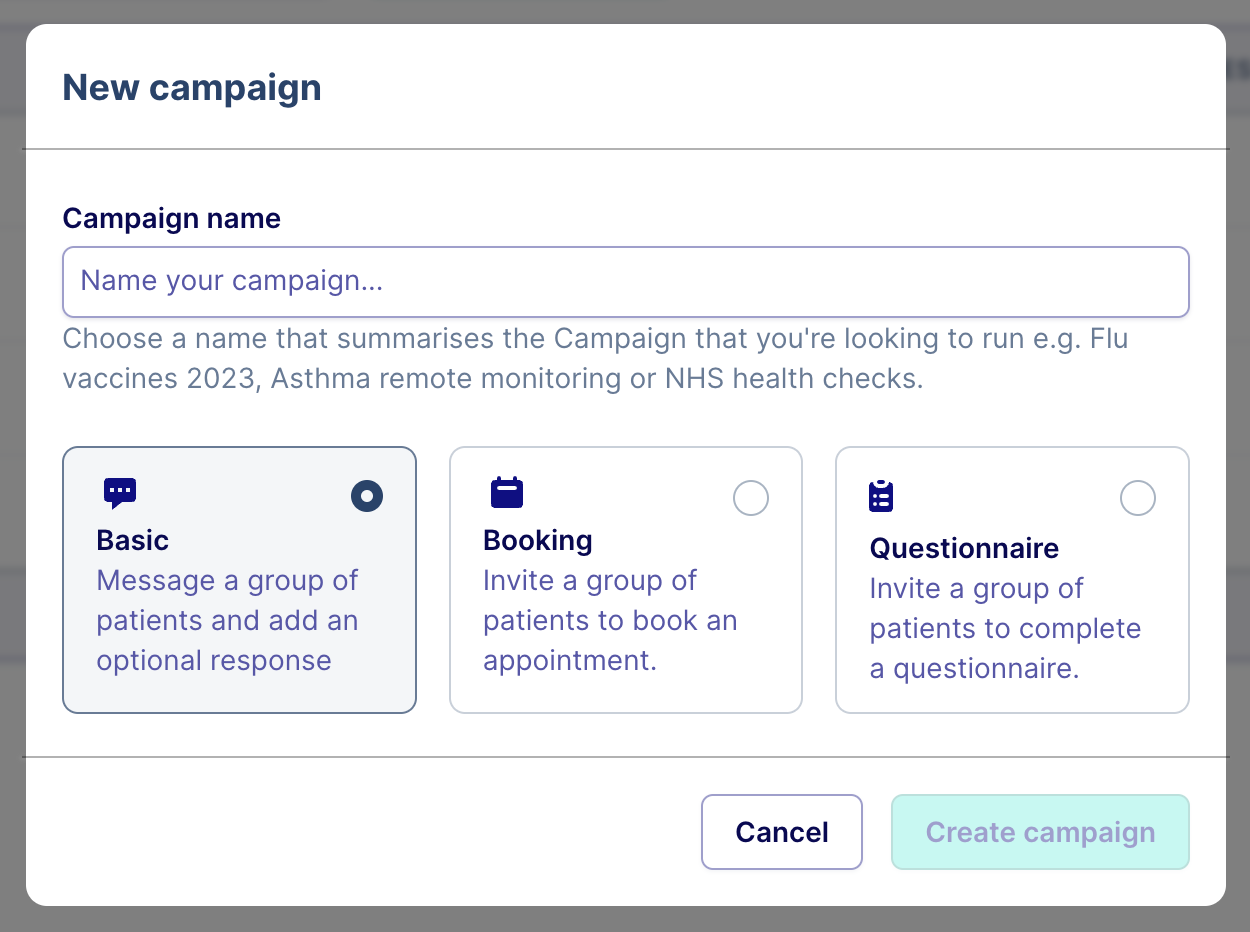 To create a new campaign, click + New campaign, in the top left of the page. A pop-up will appear with a name field and 3 options for you to choose the type of campaign you would like to send. To send a batch message with just information or the option to respond, use the basic campaign type. Name your campaign, choose a type and continue by selecting Create campaign.