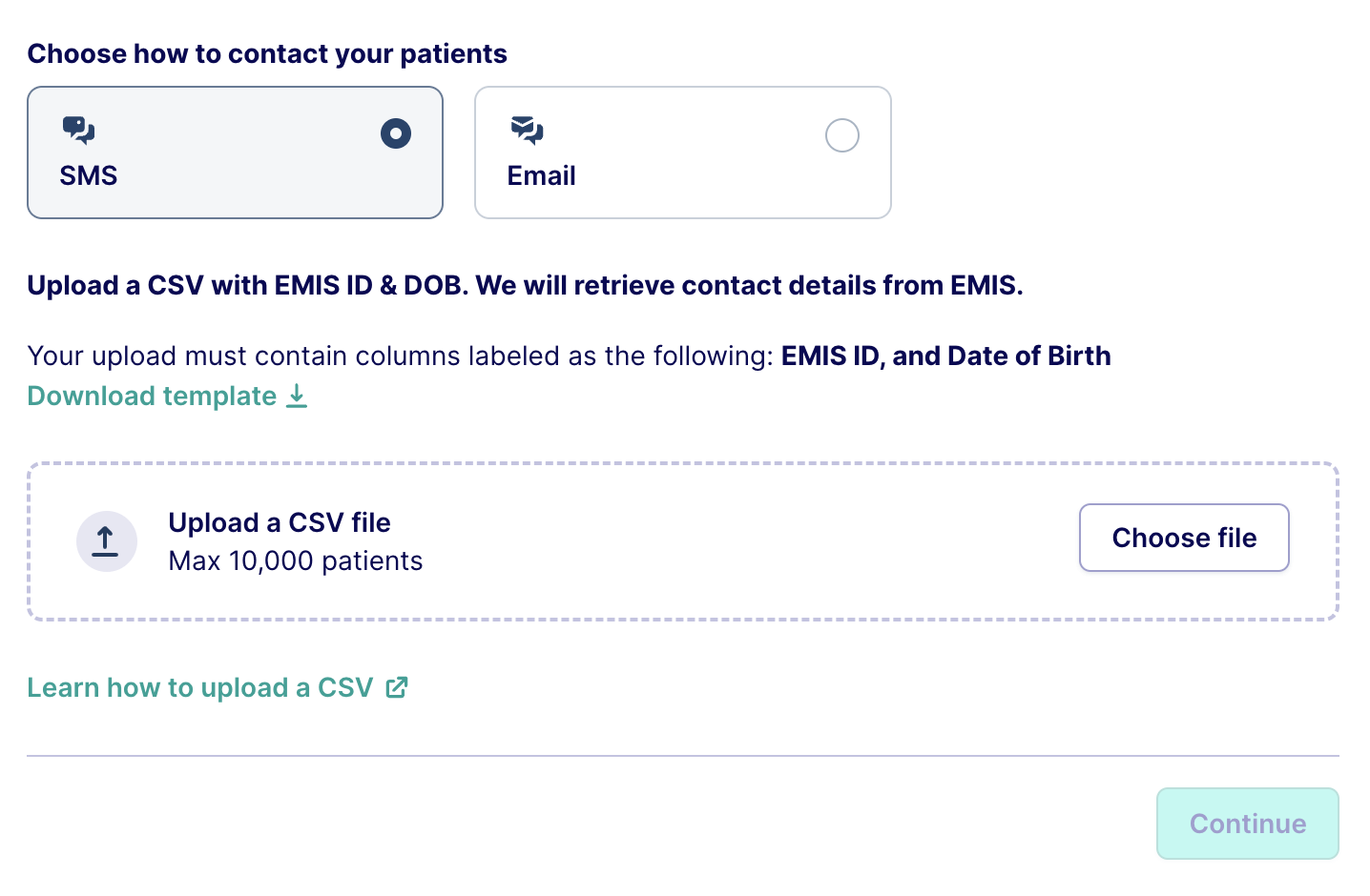To prepare your batch message, the next step is to upload your patient list. This list contains all the patients you want to add to the campaign. You can obtain this list as a CSV file from your GP System (EMIS or System One). To upload your patient list, select the type of messages you would like to send to your patients (This could be an “SMS” or “Email” message). Next, click the “Choose file” button to choose your CSV file.