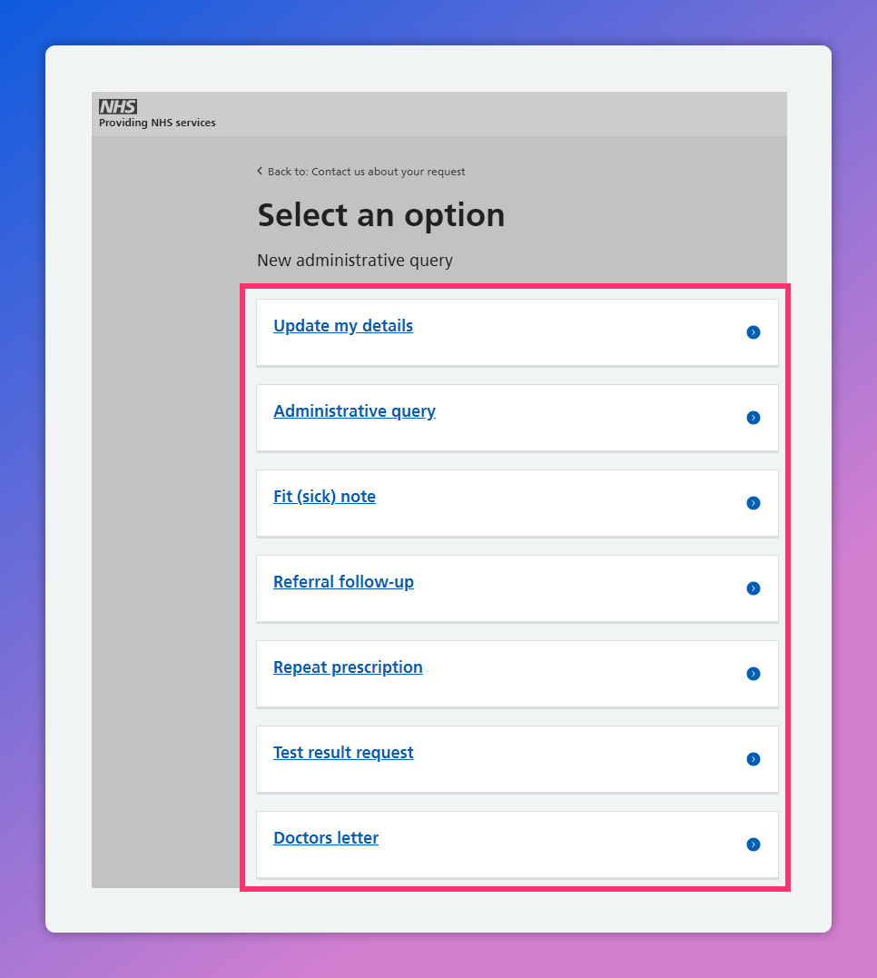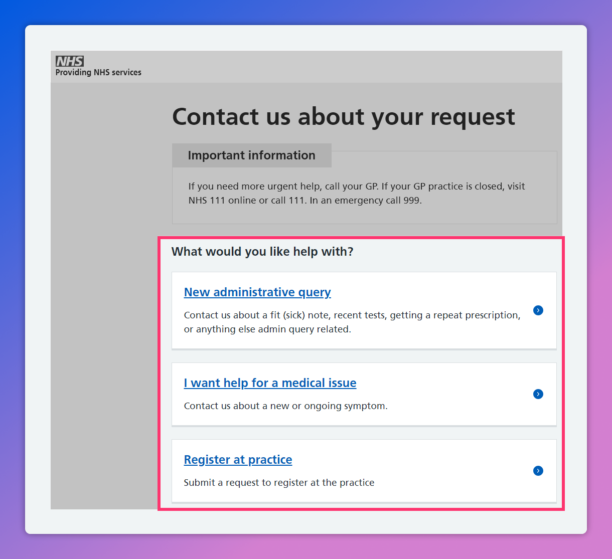 For enquiries that can't be resolved by directing elsewhere, self-help, self-referral or a real-time booking - you can setup request forms for patients to provide information to you in a structured way. You can configure different forms for medical enquiries and administrative requests.