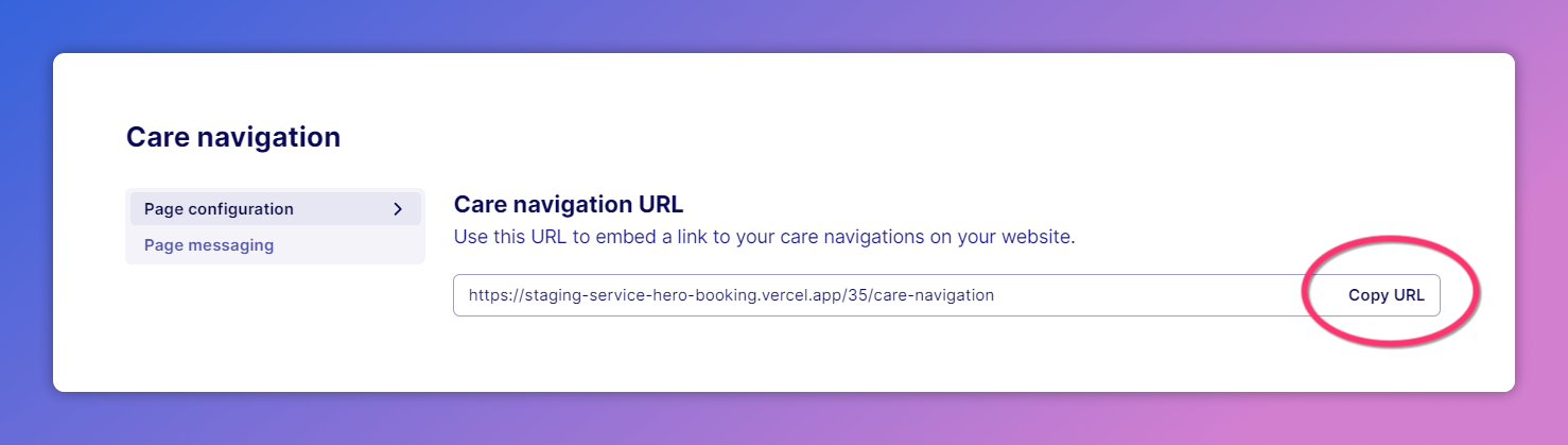 To find your practice's unique Care Navigation link, go to the Care Navigation page configuration and click 'Copy URL'. The copied web link will take patients to your practice's specifically configured Care Navigation page.