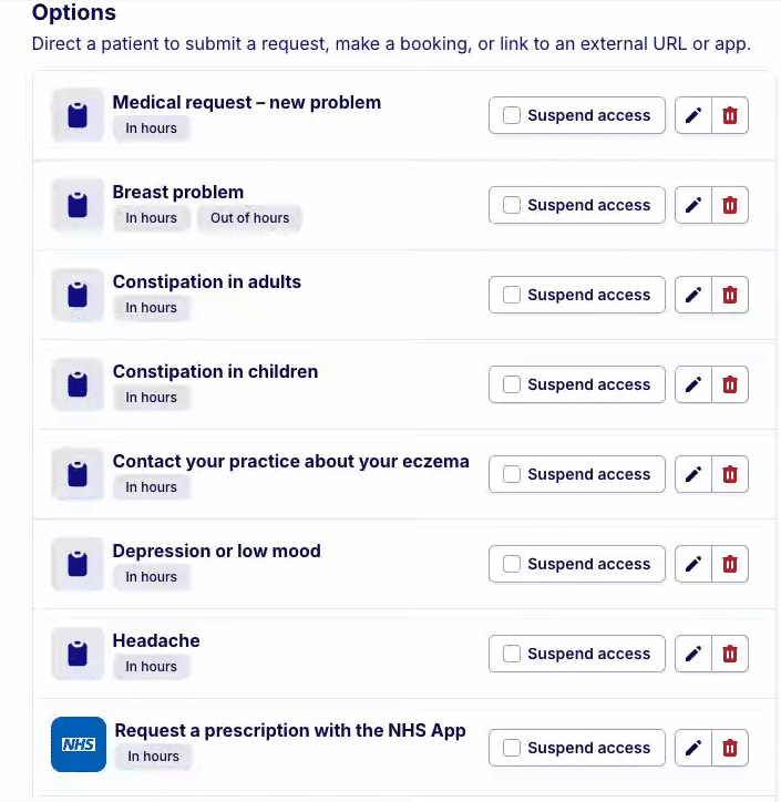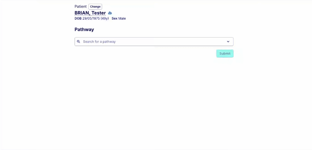 Once you have created your request template, you can add it to your care navigation pathway. To make it visible to admins but not your patients you will need to 'Suspend access' by ticking the box next to the request type and then click 'Update pathway'. Once you have done this, you can go to step one in this guide to submit a request on behalf of a patient.