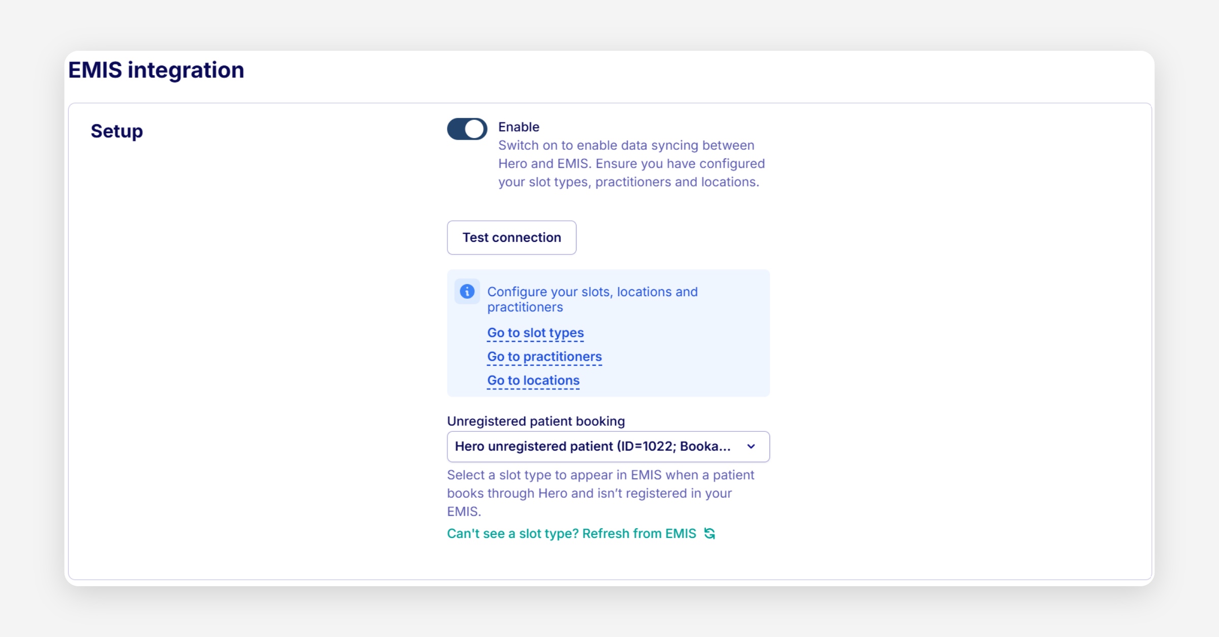 This slot type serves as a placeholder for bookings where a patient cannot be matched within your EMIS instance at the time of scheduling. The Hero Unregistered Patient Slot Type allows the booking to proceed and guarantees that the time slot is reserved in EMIS, while also creating a visual indicator to signal a pending verification or a required manual reconciliation process.